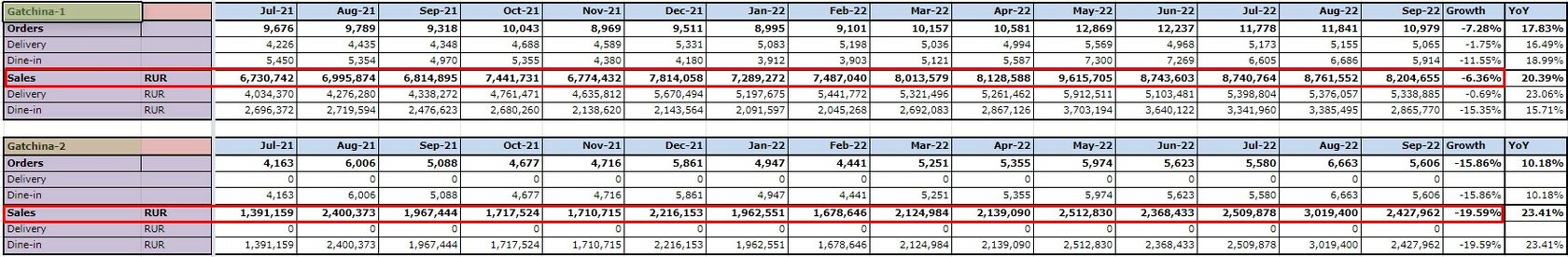 В Гатчине открыто 2 точки Додо, в совокупности они показывают выручку порядка 12 млн.руб., что является отличным результатом и говорит о перспективе рынка. Более подробно с результатами работы можно ознакомиться по ссылкам (Гатчина-1, Гатчина-2 и в таблице Dodo pizza global retail sales)