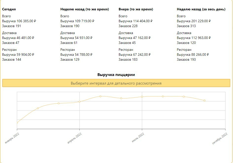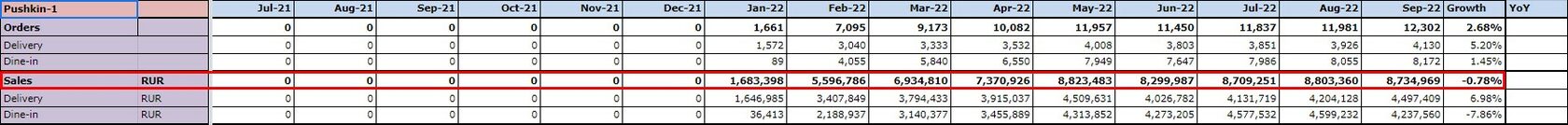 Додо пицца в Пушкине открылась 10.01.2022 и можно смело заявить, что точка стартовала успешно. Уже на второй месяц вышла на показатель 5,5 млн оборота и далее - товарооборот увеличивался быстрыми темпами. В последние 3 месяца точка делает более 8 млн оборота, что является отличным результатом и говорит о том, что в город можно и нужно заходить с семейным кафе ПиццаФабрики. (см. Выручка Пушкин-1)