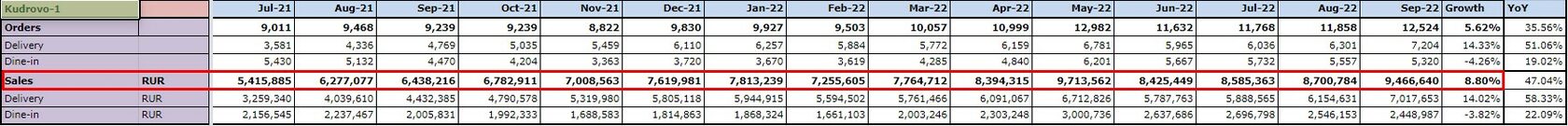 В Кудрово открыта одна точка Додо, её выручка составляет около 8,5 млн руб. в мес., пик выручки пришелся на май 2022 и составил 9 713 562 руб. Такой результат еще раз подтверждает перспективу открытия в данном городе. Более подробно с результатами работы можно ознакомиться по ссылкам (https://dodostats.ru/kudrovo-1 и в таблице Dodo pizza global retail sales https://clck.ru/R4mvB)