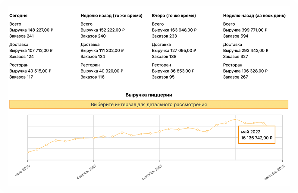 Работы заведения, продаж, маржинальности продукции и других производственных показателей в режиме онлайн.